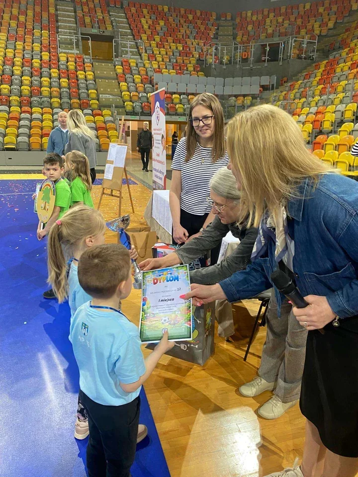 Każdy zespół otrzymał pamiątkowe medale, dyplomy i nagrody, więc żadne dziecko nie wychodziło z hali z pustymi rękami. W takich wydarzeniach to ważne, bo finał nie zostawia poczucia przegranej, tylko buduje wspomnienie wspólnego wysiłku i dobrze spędzonego czasu. Dla wielu przedszkolaków to pewnie pierwszy kontakt z rywalizacją w takiej formie – bez presji, za to z pełnym wsparciem dorosłych.